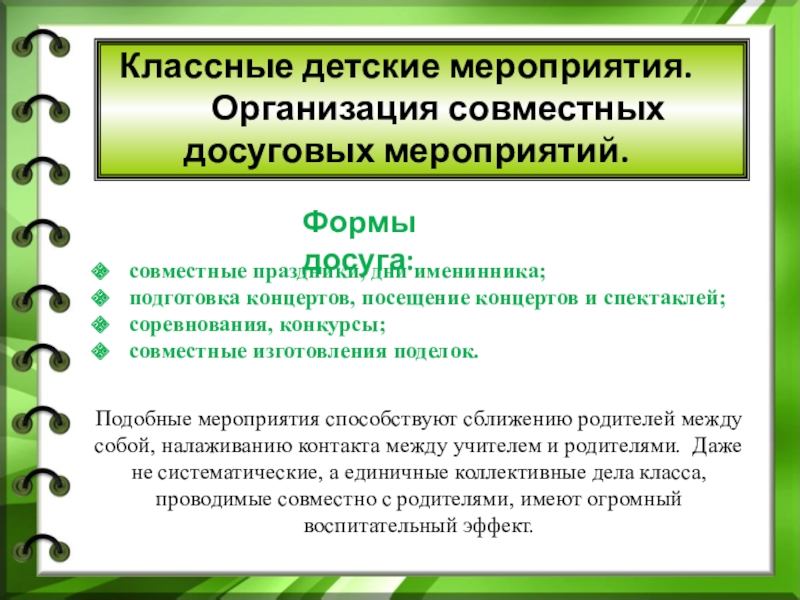 Подобные мероприятия способствуют сближению родителей между собой, налаживанию контакта между учителем и родителями. Даже не систематические, а единичные коллективные дела класса, проводимые совместно с родителями, имеют огромный воспитательный эффект.