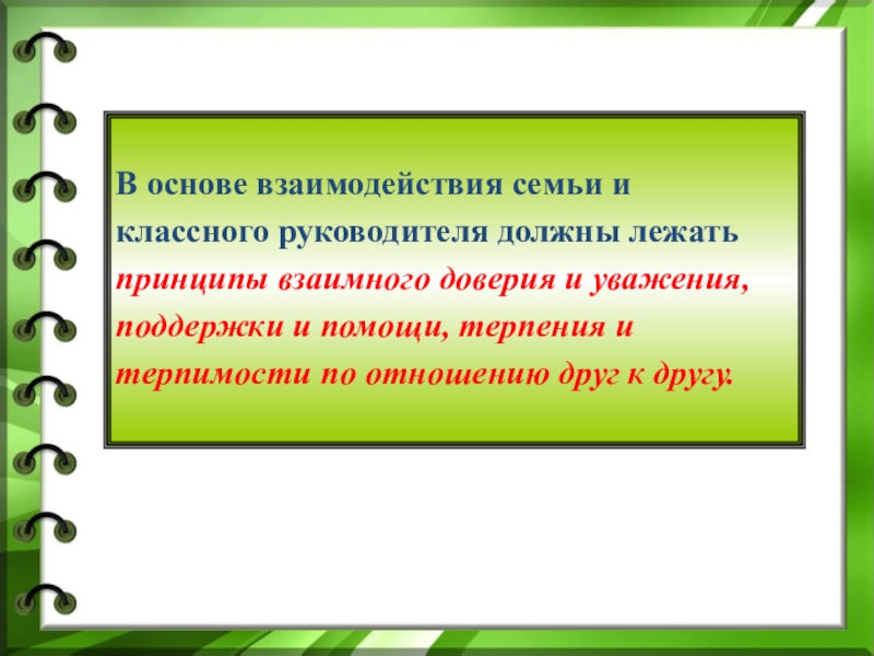 Слайд 6В основе взаимодействия семьи и классного руководителя должны лежать принципы взаимного