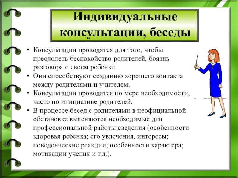 Педагог беседует с родителями о характере, интересах и склонностях ребенка, об отношении к родителям, к школе, информирует родителей об успехах их ребенка, дает советы по организации выполнения домашних заданий и т.д.