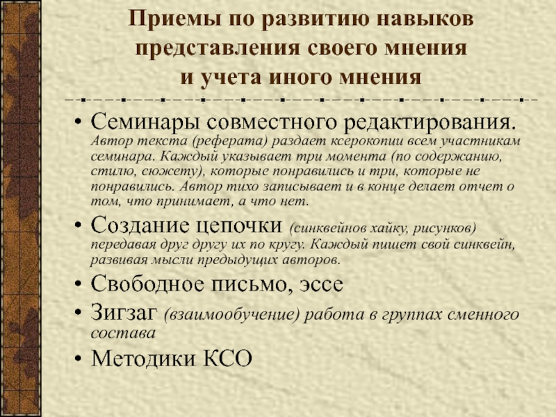 Слайд 47Приемы по развитию навыков представления своего мнения