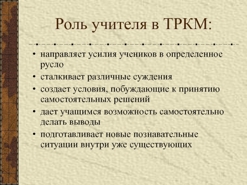 Слайд 15Роль учителя в ТРКМ: