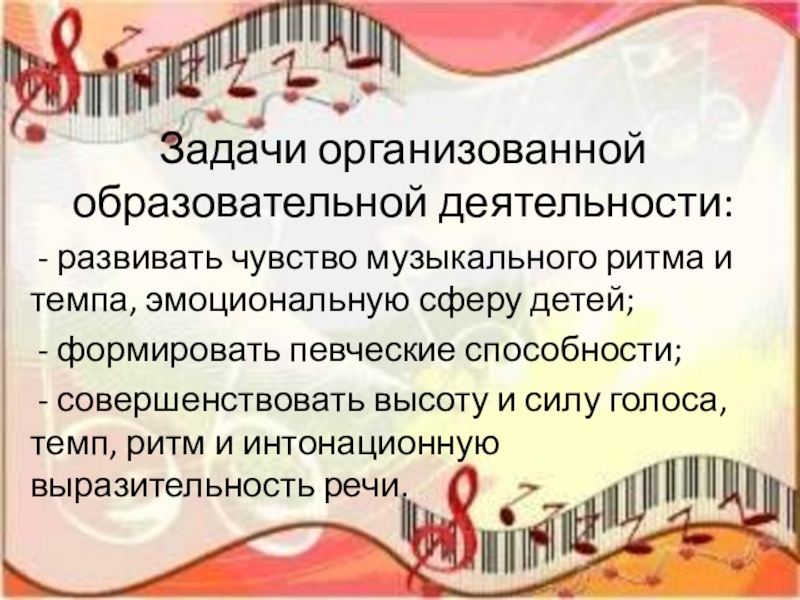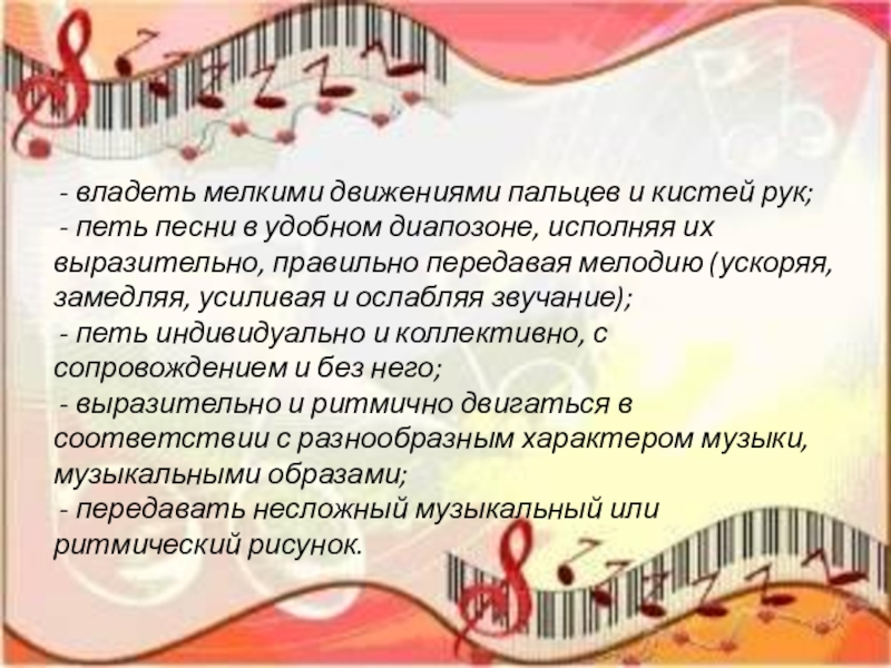 - петь песни в удобном диапозоне, исполняя их выразительно, правильно передавая мелодию (ускоряя, замедляя, усиливая и ослабляя звучание);