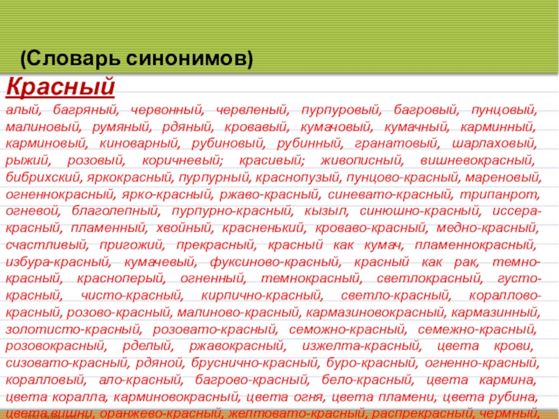 малиновый, румяный, рдяный, кровавый, кумачовый, кумачный, карминный, карминовый, киноварный, рубиновый, рубинный, гранатовый, шарлаховый, рыжий, розовый, коричневый; красивый; живописный, вишневокрасный, бибрихский, яркокрасный, пурпурный, краснопузый, пунцово-красный, мареновый, огненнокрасный, ярко-красный, ржаво-красный, синевато-красный, трипанрот, огневой, благолепный, пурпурно-красный, кызыл, синюшно-красный, иссера-красный, пламенный, хвойный, красненький, кроваво-красный, медно-красный, счастливый, пригожий, прекрасный, красный как кумач, пламеннокрасный, избура-красный, кумачевый, фуксиново-красный, красный как рак, темно-красный, красноперый, огненный, темнокрасный, светлокрасный, густо-красный, чисто-красный, кирпично-красный, светло-красный, кораллово-красный, розово-красный, малиново-красный, кармазиновокрасный, кармазинный, золотисто-красный, розовато-красный, семожно-красный, семежно-красный, розовокрасный, рделый, ржавокрасный, изжелта-красный, цвета крови, сизовато-красный, рдяной, бруснично-красный, буро-красный, огненно-красный, коралловый, ало-красный, багрово-красный, бело-красный, цвета кармина, цвета коралла, карминовокрасный, цвета огня, цвета пламени, цвета рубина, цвета вишни, оранжево-красный, желтовато-красный, распрекрасный, чермный, цвета зари, ферраллитный