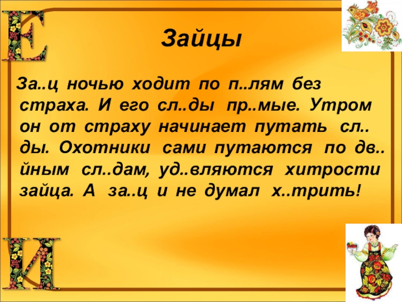 сл..ды пр..мые. Утром он от страху начинает путать сл..ды. Охотники сами путаются по дв..йным сл..дам, уд..вляются хитрости зайца. А за..ц и не думал х..трить!