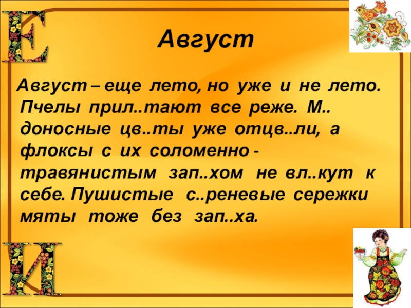 Пчелы прил..тают все реже. М..доносные цв..ты уже отцв..ли, а флоксы с их соломенно - травянистым зап..хом не вл..кут к себе. Пушистые с..реневые сережки мяты тоже без зап..ха.