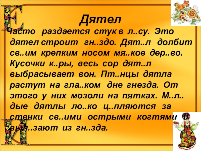 гн..здо. Дят..л долбит св..им крепким носом мя..кое дер..во. Кусочки к..ры, весь сор дят..л выбрасывает вон. Пт..нцы дятла растут на гла..ком дне гнезда. От этого у них мозоли на пятках. М..л..дые дятлы ло..ко ц..пляются за стенки св..ими острыми когтями и выл..зают из гн..зда.