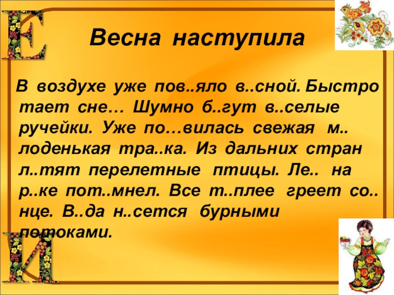 Шумно б..гут в..селые ручейки. Уже по…вилась свежая м..лоденькая тра..ка. Из дальних стран л..тят перелетные птицы. Ле.. на р..ке пот..мнел. Все т..плее греет со..нце. В..да н..сется бурными потоками.