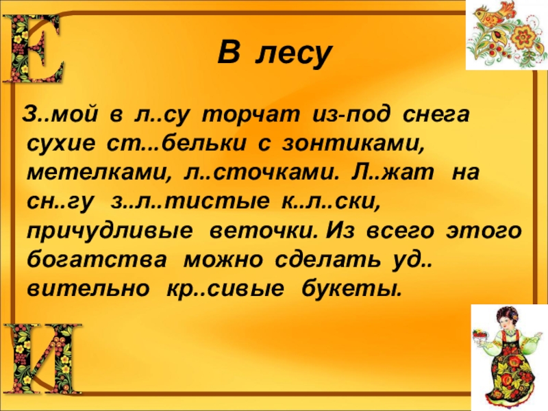 с зонтиками, метелками, л..сточками. Л..жат на сн..гу з..л..тистые к..л..ски, причудливые веточки. Из всего этого богатства можно сделать уд..вительно кр..сивые букеты.