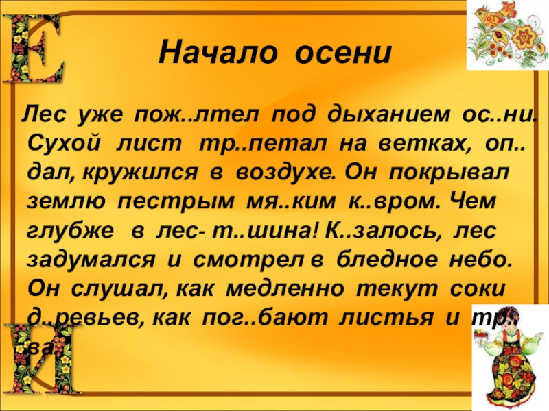 лист тр..петал на ветках, оп..дал, кружился в воздухе. Он покрывал землю пестрым мя..ким к..вром. Чем глубже в лес- т..шина! К..залось, лес задумался и смотрел в бледное небо. Он слушал, как медленно текут соки д..ревьев, как пог..бают листья и тр..ва.