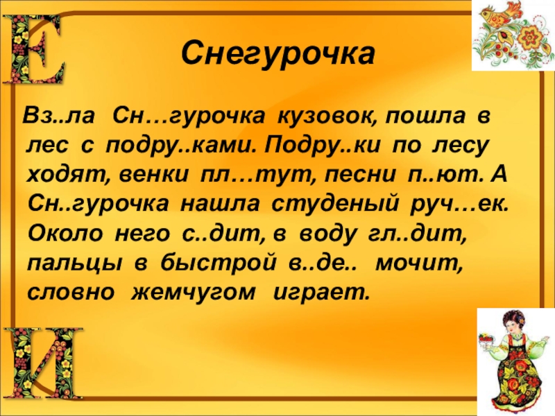 Подру..ки по лесу ходят, венки пл…тут, песни п..ют. А Сн..гурочка нашла студеный руч…ек. Около него с..дит, в воду гл..дит, пальцы в быстрой в..де.. мочит, словно жемчугом играет.