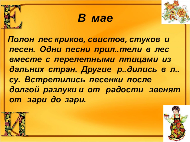 песни прил..тели в лес вместе с перелетными птицами из дальних стран. Другие р..дились в л..су. Встретились песенки после долгой разлуки и от радости звенят от зари до зари.