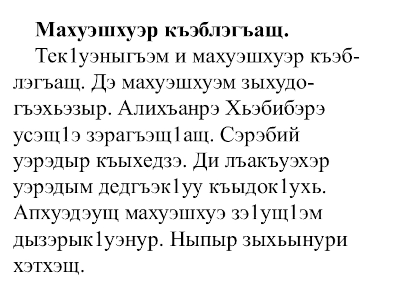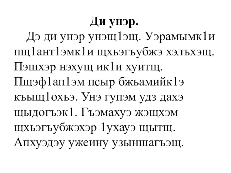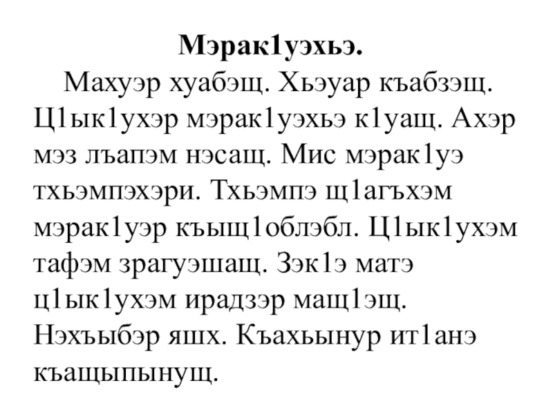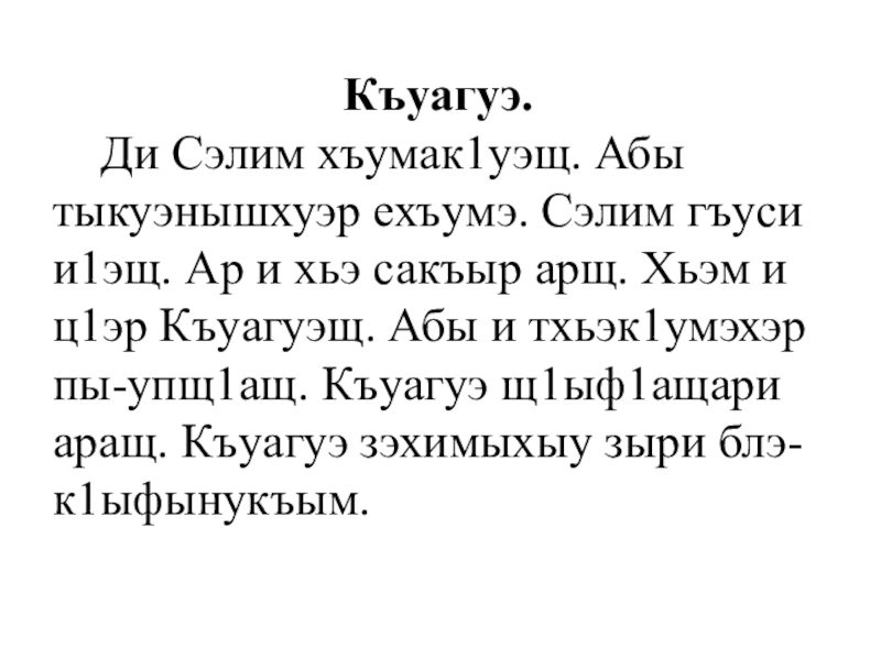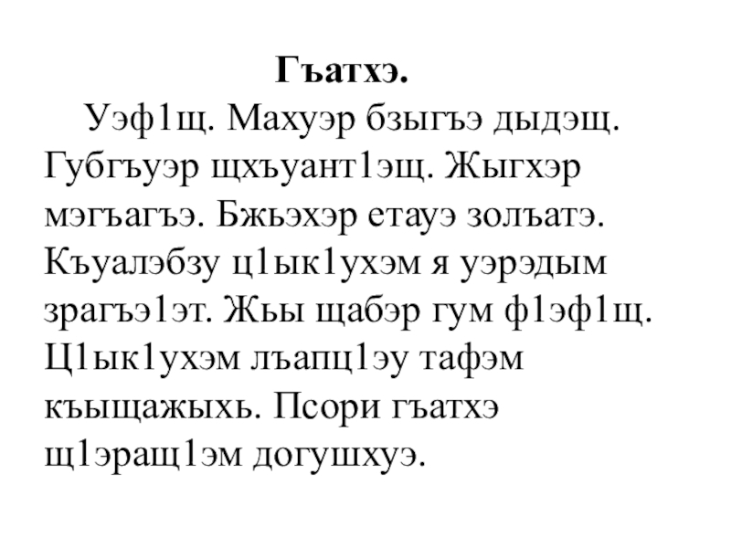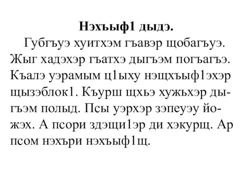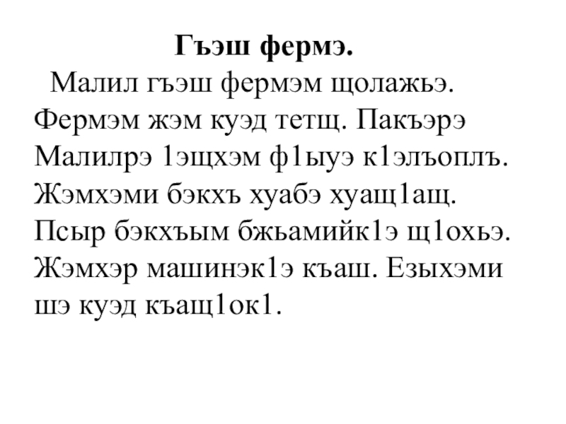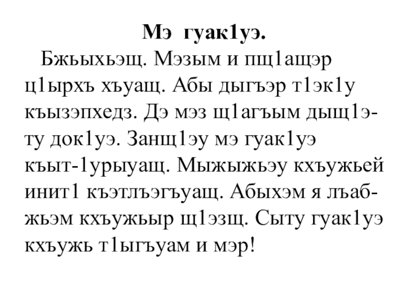 фо т1эк1у илът. Фом хъум-п1эц1эджхэр ежат. Ахэр кхъуэщыным кърахужащ. Кхъуэщыныр к1апсэк1э лъа-гэу ф1адзащ. Зы хъумп1эц1эдж кхъуэщы-ным къинат. Ар к1апсэмк1э унащхьэм дэк1уеящ. Ит1анэ блынымк1э къехыжащ. Абык1э адрей хъумп1эц1эджхэми к1уа-п1эр къащ1ащ. Фор псори ирашхык1ащ.