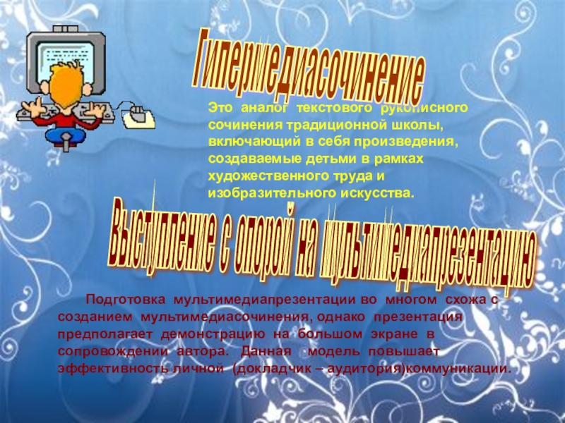 Подготовка мультимедиапрезентации во многом схожа с созданием мультимедиасочинения, однако презентация предполагает демонстрацию на большом экране в сопровождении автора. Данная модель повышает эффективность личной (докладчик – аудитория)коммуникации.