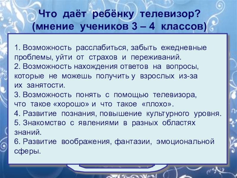 1. Возможность расслабиться, забыть ежедневные проблемы, уйти от страхов и переживаний. 2. Возможность нахождения ответов на вопросы, которые не можешь получить у взрослых из-за их занятости. 3. Возможность понять с помощью телевизора, что такое «хорошо» и что такое «плохо». 4. Развитие познания, повышение культурного уровня. 5. Знакомство с явлениями в разных областях знаний. 6. Развитие воображения, фантазии, эмоциональной сферы.
