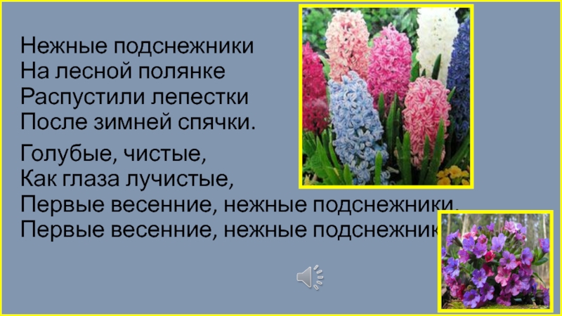 Голубые, чистые, Как глаза лучистые, Первые весенние, нежные подснежники. Первые весенние, нежные подснежники.