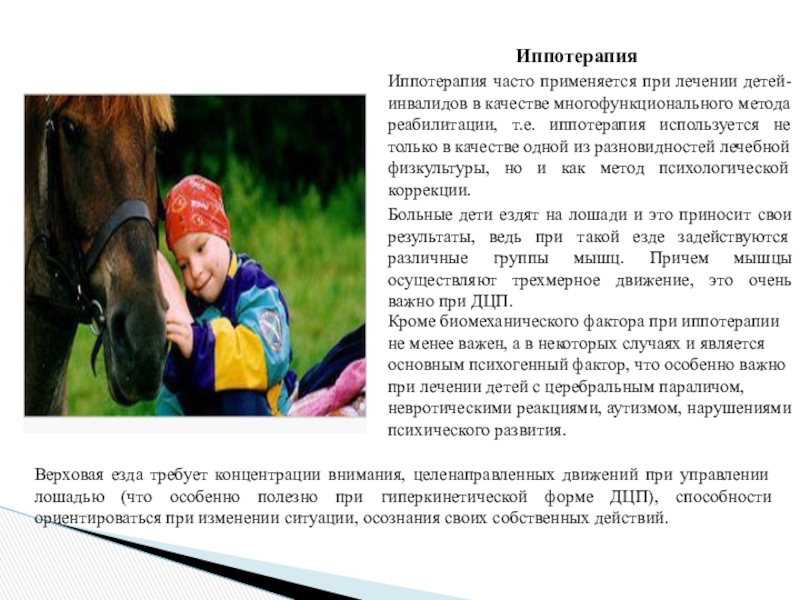Иппотерапия часто применяется при лечении детей-инвалидов в качестве многофункционального метода реабилитации, т.е. иппотерапия используется не только в качестве одной из разновидностей лечебной физкультуры, но и как метод психологической коррекции.