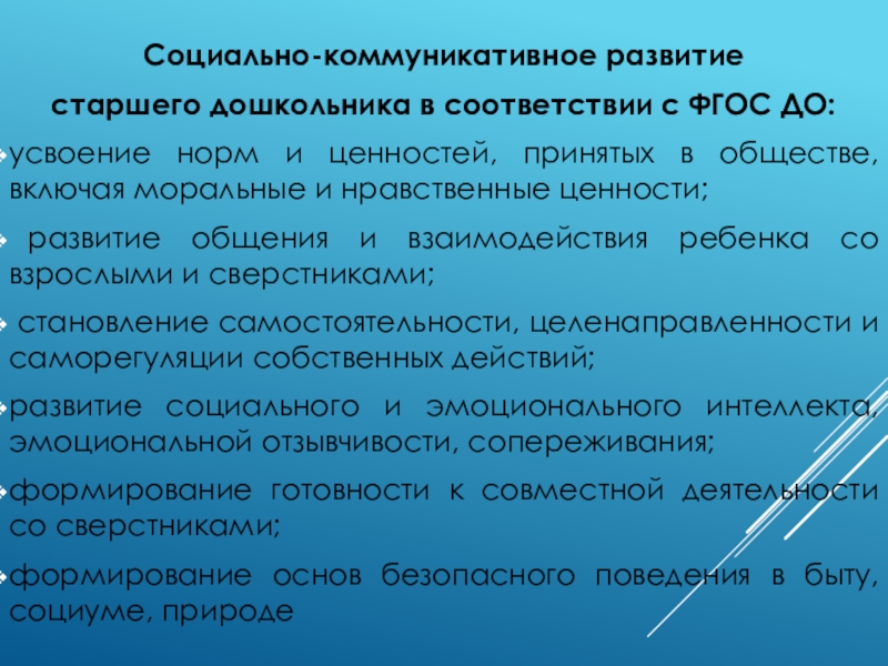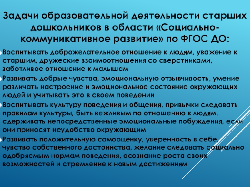 Слайд 15Задачи образовательной деятельности старших дошкольников в области «Социально-коммуникативное развитие» по ФГОС