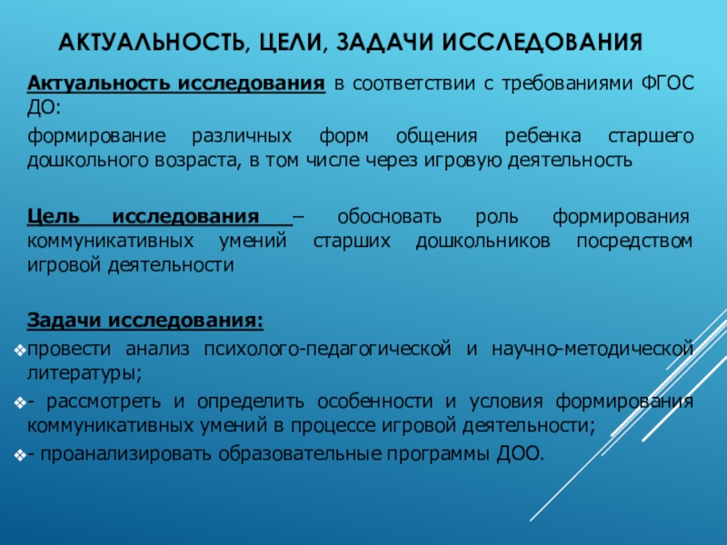 Цель исследования – обосновать роль формирования коммуникативных умений старших дошкольников посредством игровой деятельности