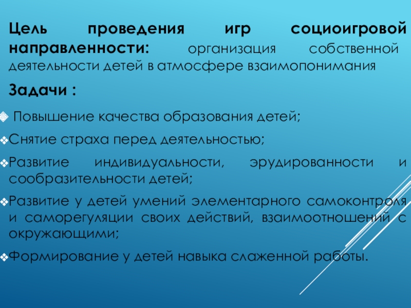 Цель проведения игр социоигровой направленности: организация собственной деятельности детей в атмосфере