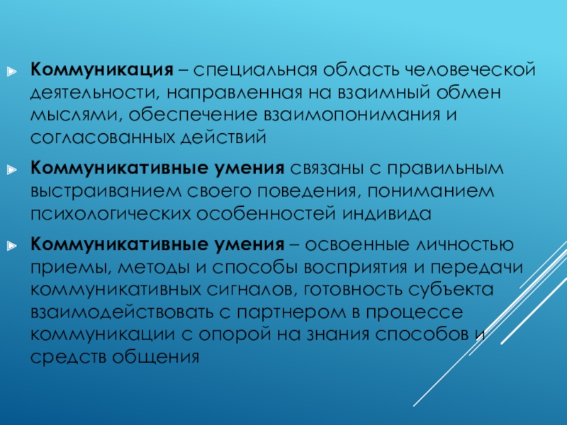 Слайд 3Коммуникация – специальная область человеческой деятельности, направленная на взаимный обмен мыслями,