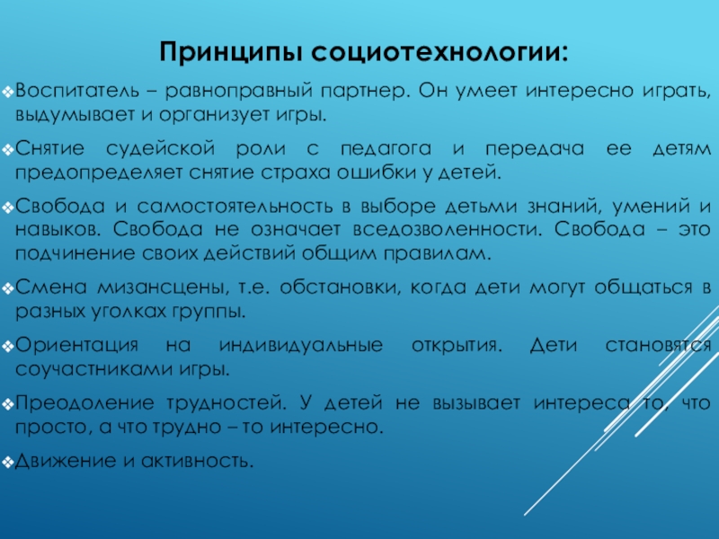 Свобода и самостоятельность в выборе детьми знаний, умений и навыков. Свобода не означает вседозволенности. Свобода – это подчинение своих действий общим правилам.