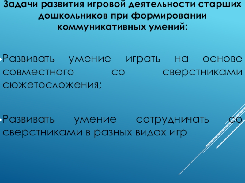 Слайд 14Задачи развития игровой деятельности старших дошкольников при формировании коммуникативных умений: