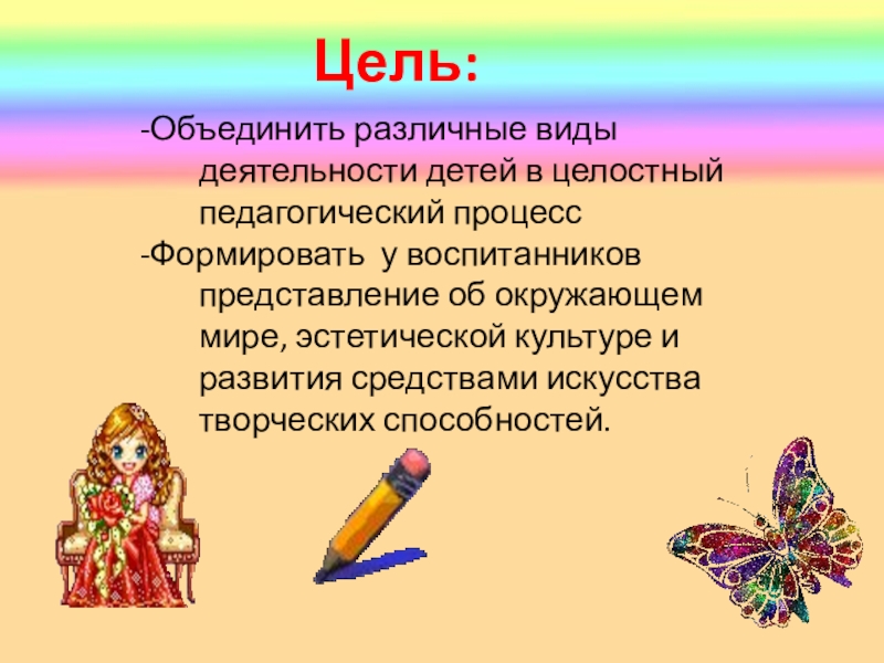 -Объединить различные виды деятельности детей в целостный педагогический процесс