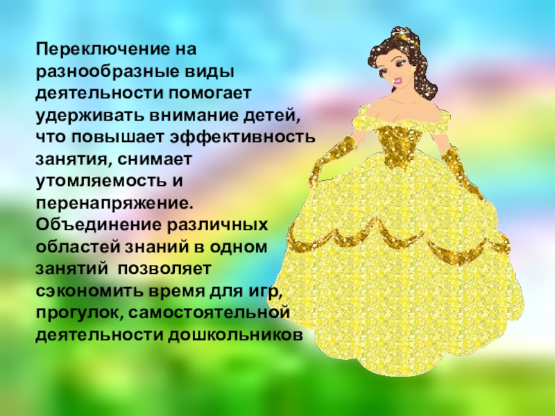 повышает эффективность занятия, снимает утомляемость и перенапряжение. Объединение различных областей знаний в одном занятий позволяет сэкономить время для игр, прогулок, самостоятельной деятельности дошкольников