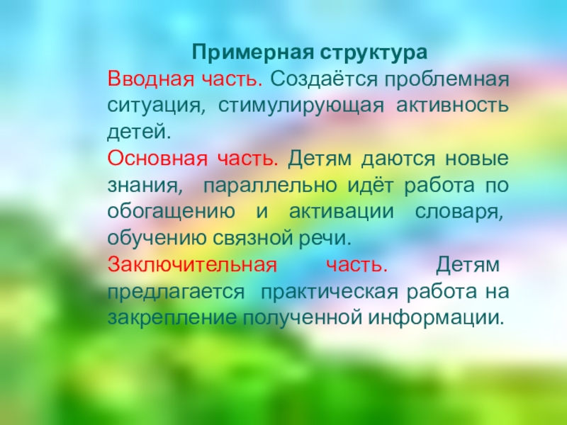 часть. Детям даются новые знания, параллельно идёт работа по обогащению и активации словаря, обучению связной речи.