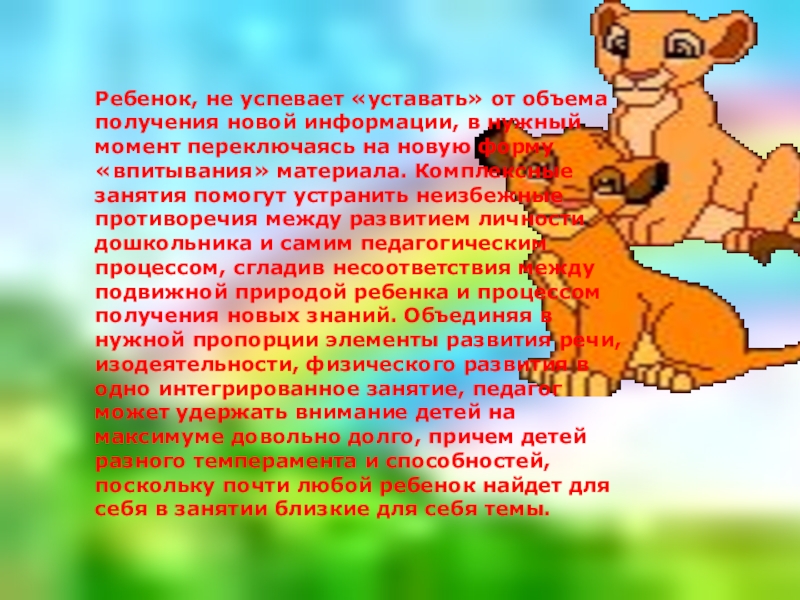 нужный момент переключаясь на новую форму «впитывания» материала. Комплексные занятия помогут устранить неизбежные противоречия между развитием личности дошкольника и самим педагогическим процессом, сгладив несоответствия между подвижной природой ребенка и процессом получения новых знаний. Объединяя в нужной пропорции элементы развития речи, изодеятельности, физического развития в одно интегрированное занятие, педагог может удержать внимание детей на максимуме довольно долго, причем детей разного темперамента и способностей, поскольку почти любой ребенок найдет для себя в занятии близкие для себя темы.
