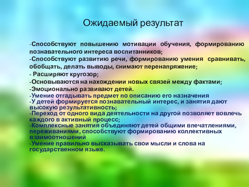 Посредством комплексного занятия гораздо активнее и быстрее происходит возбуждение познавательного интереса, т.к. дети, участвуя в различных сферах, реализовывают свои способности и потенциальные возможности. На занятиях активизируются психические процессы дошкольников в игровой деятельности: речь, внимание, память, мышление, воображение, развитие.