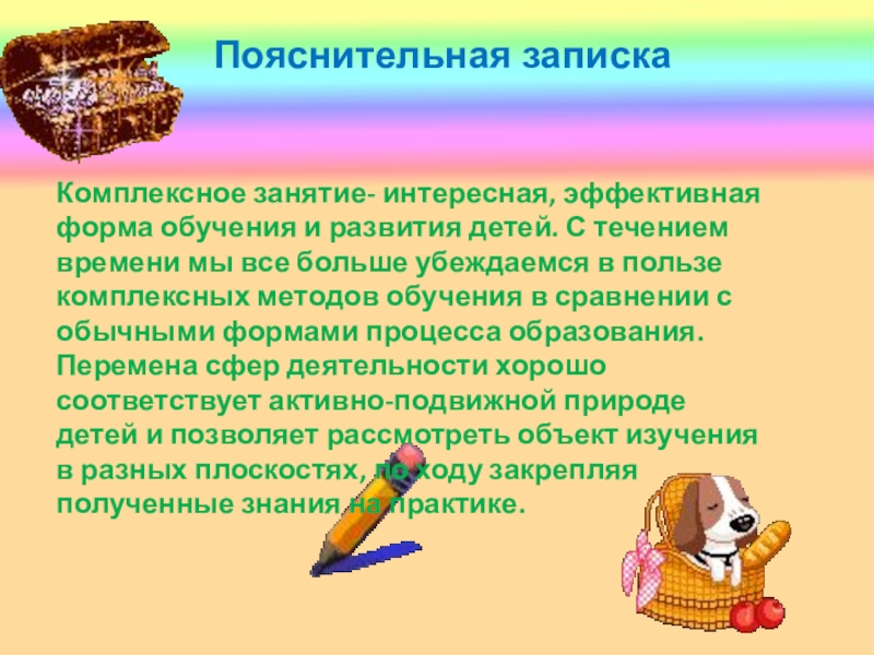 С течением времени мы все больше убеждаемся в пользе комплексных методов обучения в сравнении с обычными формами процесса образования. Перемена сфер деятельности хорошо соответствует активно-подвижной природе детей и позволяет рассмотреть объект изучения в разных плоскостях, по ходу закрепляя полученные знания на практике.