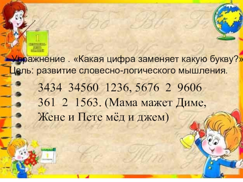 3434 34560 1236, 5676 2 9606 361 2 1563. (Мама мажет Диме, Жене и Пете мёд и джем)