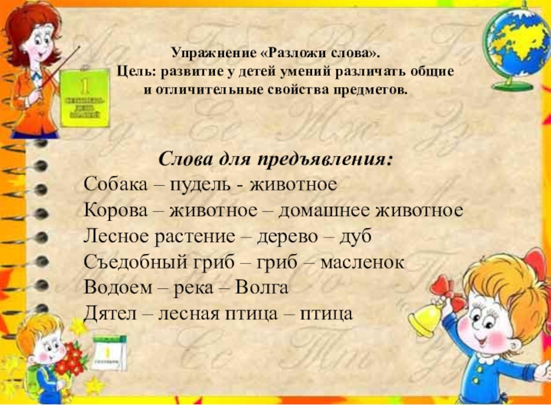 Цель: развитие у детей умений различать общие и отличительные свойства предметов.