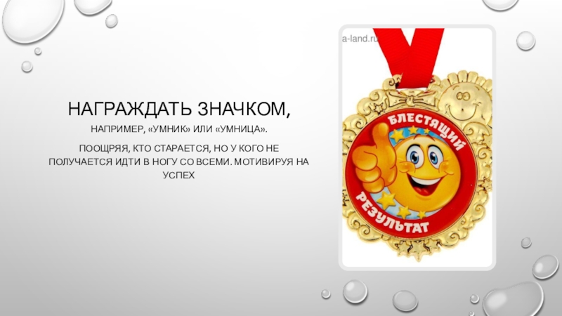 Награждать значком,например, «Умник» или «Умница».Поощряя, кто старается, но у кого не получается идти в ногу со всеми.