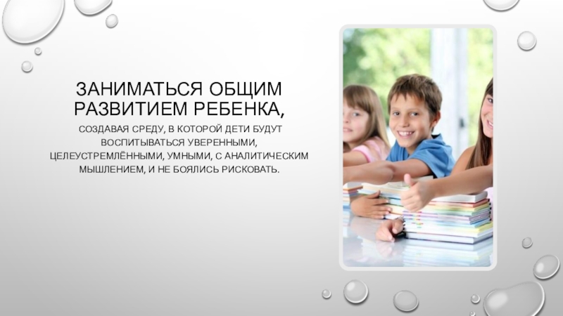 Заниматься общим развитием ребенка, создавая среду, в которой дети будут воспитываться уверенными, целеустремлёнными, умными, с аналитическим мышлением,