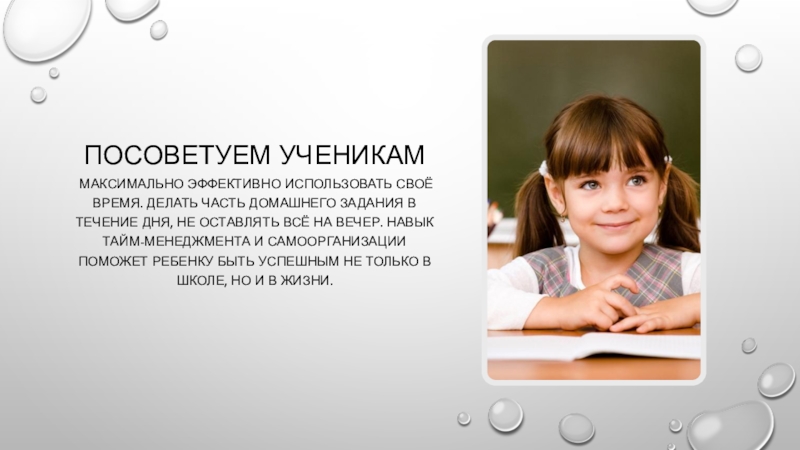 Посоветуем ученикам максимально эффективно использовать своё время. Делать часть домашнего задания в течение дня, не оставлять всё