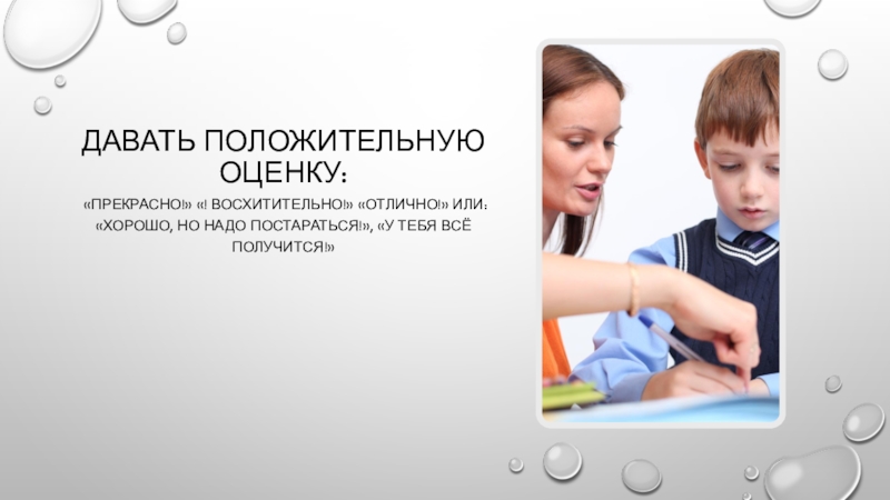 Давать положительную оценку: «Прекрасно!» «! Восхитительно!» «Отлично!» или: «Хорошо, но надо постараться!», «У тебя всё получится!»