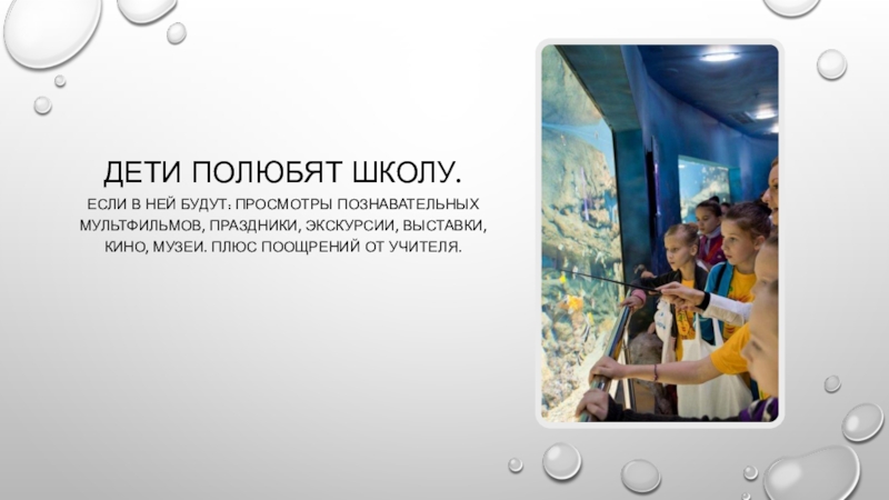Дети полюбят школу.Если в ней будут: просмотры познавательных мультфильмов, праздники, экскурсии, выставки, кино, музеи. Плюс поощрений от