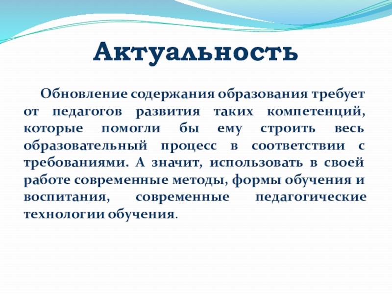 компетенций, которые помогли бы ему строить весь образовательный процесс в соответствии с требованиями. А значит, использовать в своей работе современные методы, формы обучения и воспитания, современные педагогические технологии обучения.