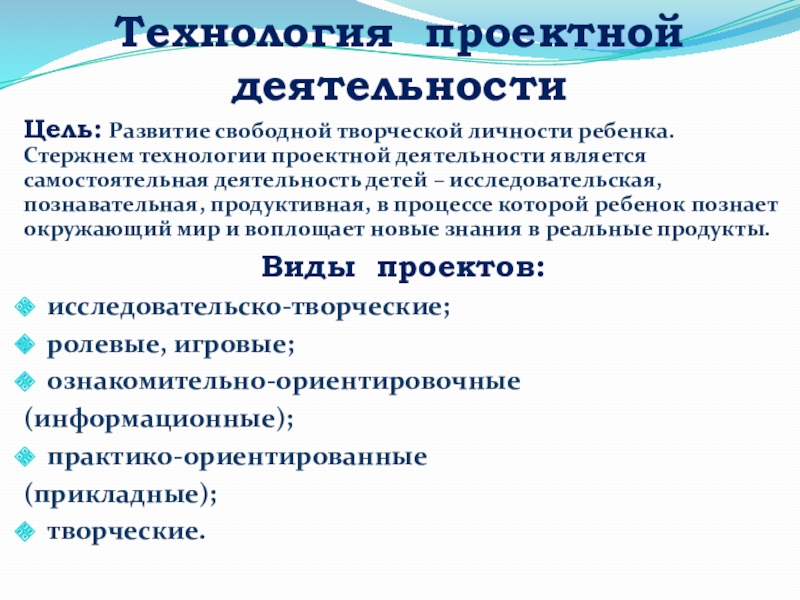 Цель: Развитие свободной творческой личности ребенка. Стержнем технологии проектной
