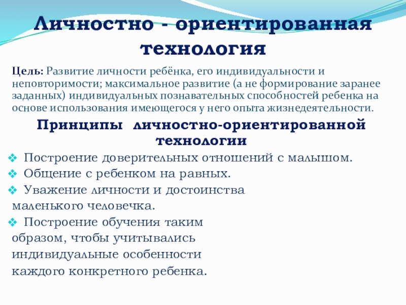 Цель: Развитие личности ребёнка, его индивидуальности и неповторимости;