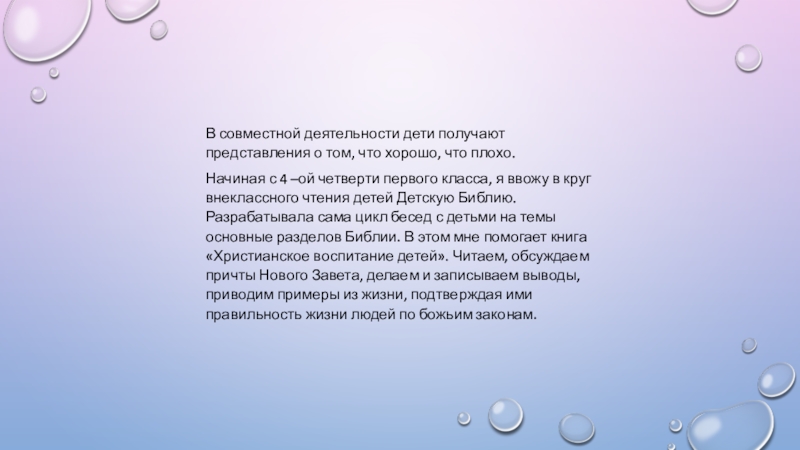 Начиная с 4 –ой четверти первого класса, я ввожу в круг внеклассного чтения детей Детскую Библию. Разрабатывала сама цикл бесед с детьми на темы основные разделов Библии. В этом мне помогает книга «Христианское воспитание детей». Читаем, обсуждаем причты Нового Завета, делаем и записываем выводы, приводим примеры из жизни, подтверждая ими правильность жизни людей по божьим законам.