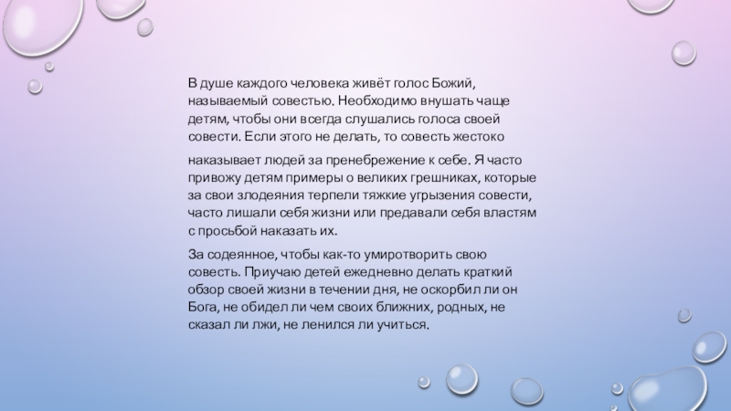 Слайд 6В душе каждого человека живёт голос Божий, называемый совестью. Необходимо внушать