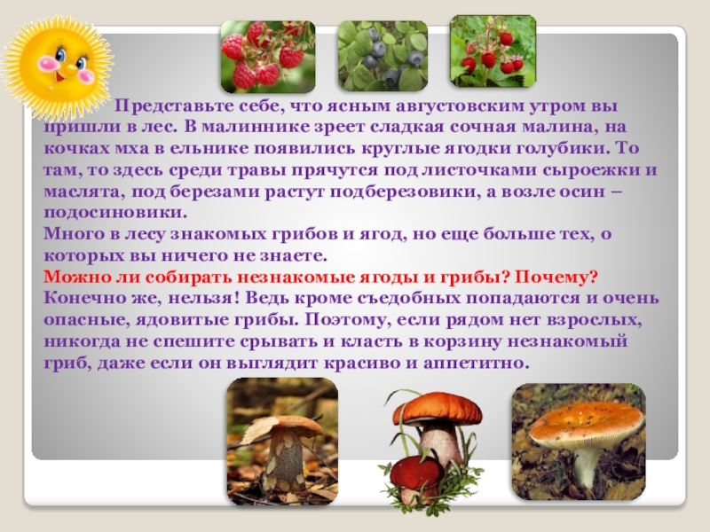 Представьте себе, что ясным августовским утром вы пришли в лес. В малиннике зреет сладкая сочная малина, на кочках мха в ельнике появились круглые ягодки голубики. То там, то здесь среди травы прячутся под листочками сыроежки и маслята, под березами растут подберезовики, а возле осин – подосиновики.