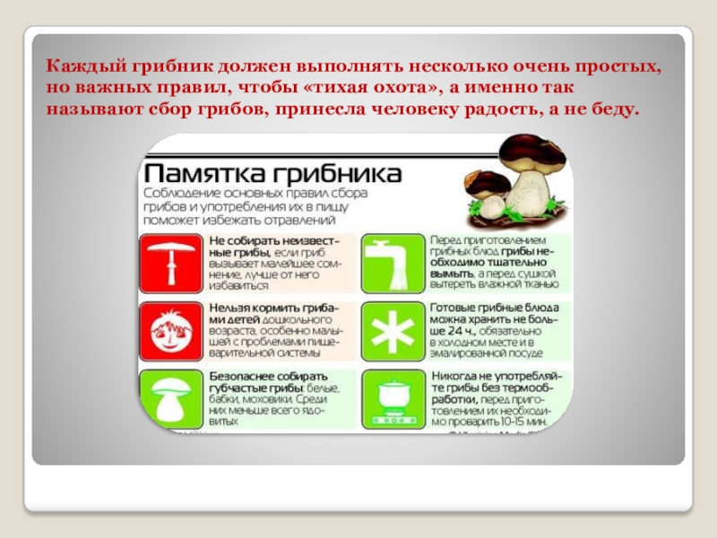 Слайд 12Каждый грибник должен выполнять несколько очень простых, но важных правил, чтобы