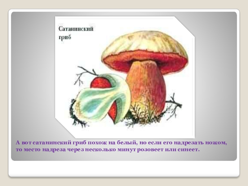Слайд 11А вот сатанинский гриб похож на белый, но если его надрезать