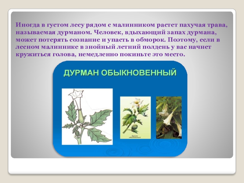 дурманом. Человек, вдыхающий запах дурмана, может потерять сознание и упасть в обморок. Поэтому, если в лесном малиннике в знойный летний полдень у вас начнет кружиться голова, немедленно покиньте это место.