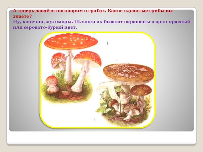 Слайд 8А теперь давайте поговорим о грибах. Какие ядовитые грибы вы знаете?