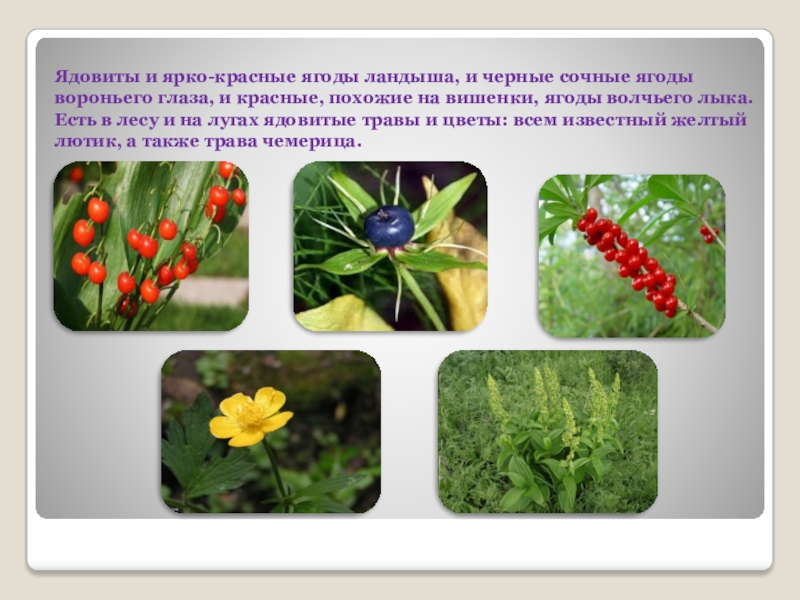 Слайд 3Ядовиты и ярко-красные ягоды ландыша, и черные сочные ягоды вороньего глаза,